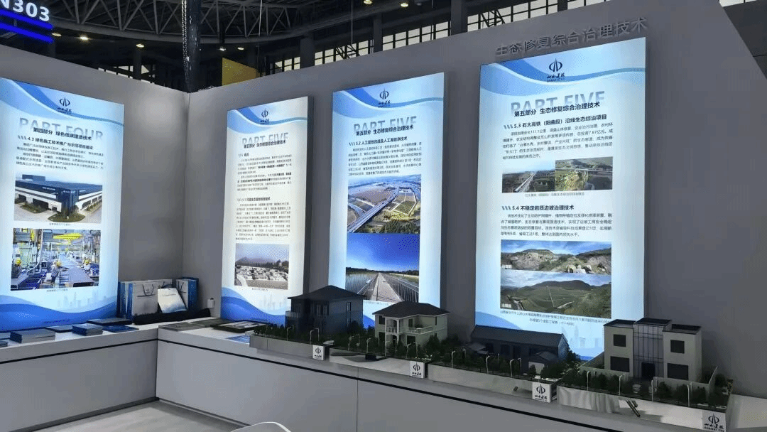 礦山生態(tài)修復(fù)技術(shù)展區(qū),展示了礦建工程設(shè)計(jì)、排矸場(chǎng)滅火、礦井充填開(kāi)采等技術(shù)。