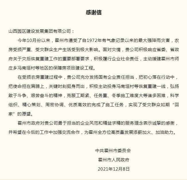 臨近除夕,一度受災(zāi)破敗的村莊展現(xiàn)出全新的容貌,一度愁容滿面的村民們臉上又展現(xiàn)出甜蜜的笑容。在馮南垣村東口的照壁上,“共建美麗鄉(xiāng)村共享美好生活”十二個(gè)大字在太陽的照耀下格外醒目,這是對(duì)此次災(zāi)后恢復(fù)重建工作的生動(dòng)詮釋,也反映出廣大村民和參與恢復(fù)重建全體人員對(duì)未來生活的信心決心。與此同時(shí),山西建投也收到了霍州市人民政府一封“沉甸甸”的感謝信。