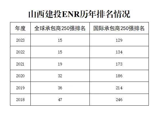 8月24日,美國《工程新聞記錄》(ENR)2023年度“全球承包商250強”和“國際承包商250強”榜單公布,山西建投集團分列第15位、第129位,國際承包商榜單較去年上升5位,這也是建投集團排名連續(xù)六年持續(xù)攀升,國際品牌競爭力連年增強。