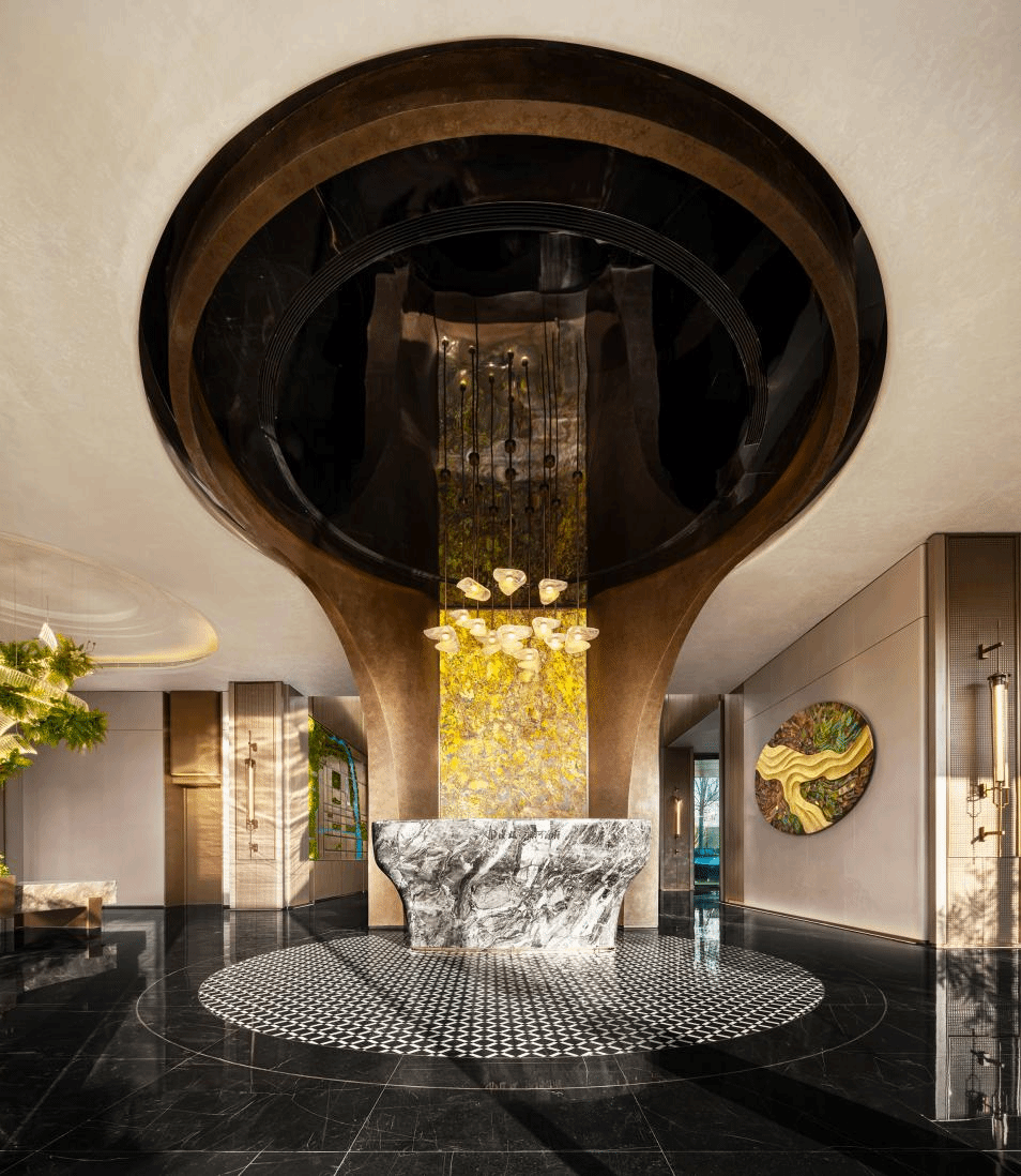 觀瀑|接待區(qū)扇形的架構(gòu)與漸變色調(diào)讓人仿佛聆聽到水流撞擊巖石的聲音,大理石接待臺如山脈般堅實且充滿韻律,主視墻流暢的紋理與縱深的層次感,宛如山水的波瀾。