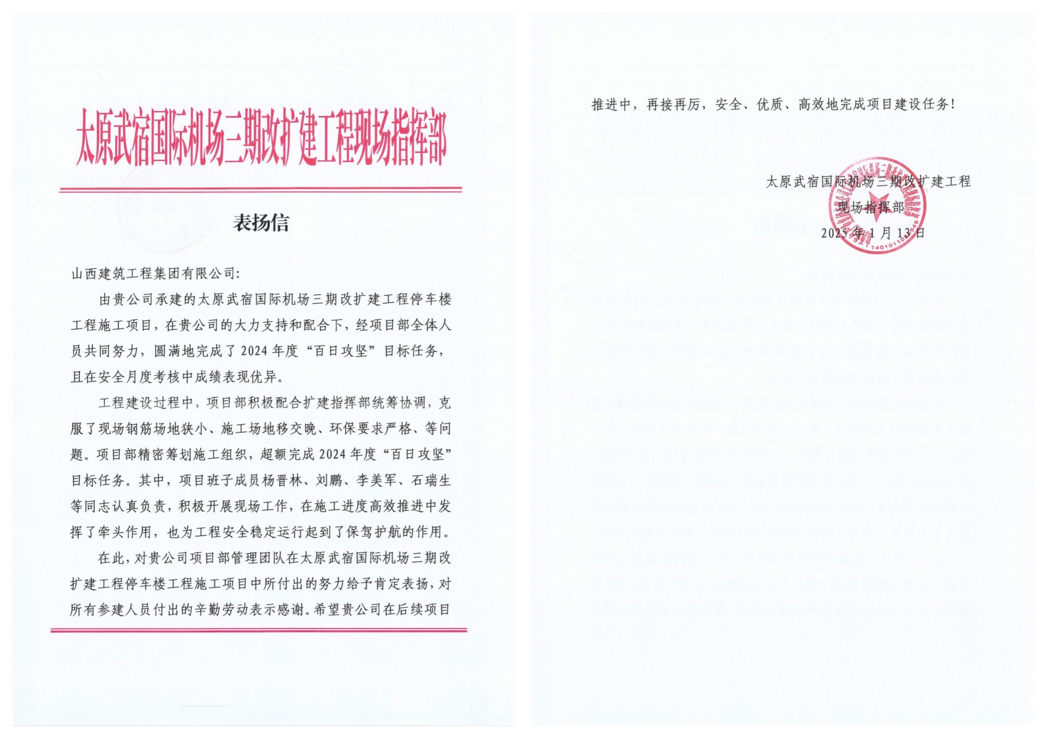 日前,太原機(jī)場(chǎng)三期改擴(kuò)建工程現(xiàn)場(chǎng)指揮部2025年安全工作會(huì)暨“百日攻堅(jiān)”勞動(dòng)競(jìng)賽表彰大會(huì)召開(kāi)。會(huì)上,山西建投集團(tuán)及所屬單位被授予百日攻堅(jiān)會(huì)戰(zhàn)突出貢獻(xiàn)獎(jiǎng)、百日攻堅(jiān)會(huì)戰(zhàn)優(yōu)秀單位獎(jiǎng)、2024年度安全文明施工先進(jìn)單位和優(yōu)秀監(jiān)理單位。