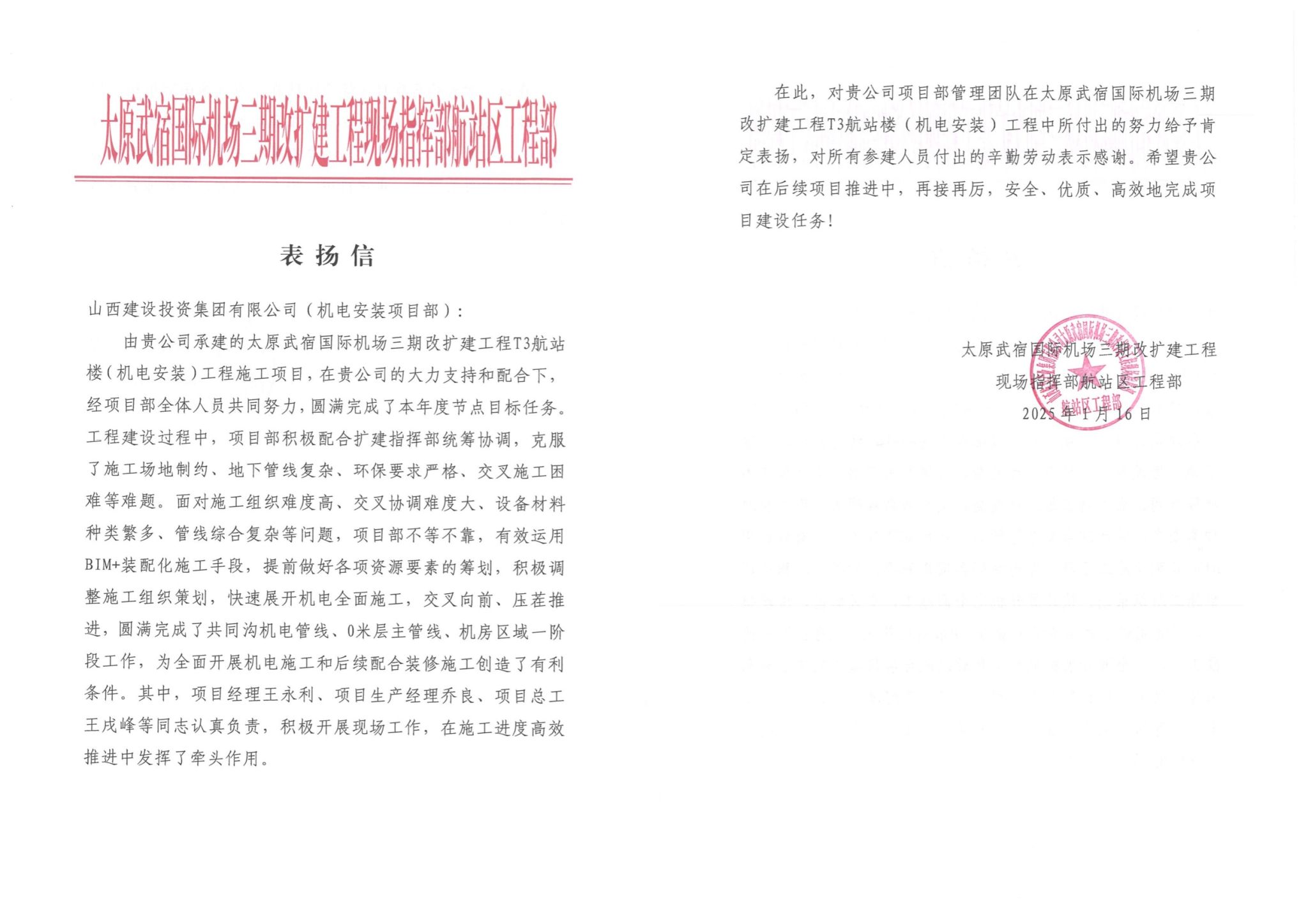 2025年初,T3航站樓,綜合交通中心,高架橋項(xiàng)目,場(chǎng)道工程一標(biāo)段,專(zhuān)項(xiàng)業(yè)務(wù)用房、北區(qū)機(jī)務(wù)及特種車(chē)輛維修中心,南區(qū)機(jī)務(wù)及公務(wù)機(jī)樓等項(xiàng)目的施工單位均收到建設(shè)方的表?yè)P(yáng)信。信中對(duì)各單位在項(xiàng)目建設(shè)中展現(xiàn)出的擔(dān)當(dāng)精神、專(zhuān)業(yè)能力和高效執(zhí)行力給予肯定,并贊揚(yáng)項(xiàng)目建設(shè)者們?cè)趶?fù)雜環(huán)境下積極配合指揮部統(tǒng)籌協(xié)調(diào),克服重重困難,壓茬推進(jìn)項(xiàng)目建設(shè),提前實(shí)現(xiàn)履約目標(biāo)的敬業(yè)精神。