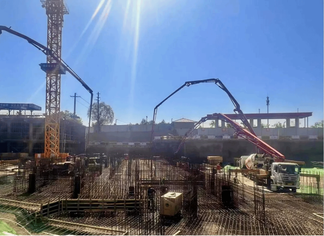 在面對(duì)筏板基礎(chǔ)大體積混凝土澆筑難題時(shí),項(xiàng)目黨員先鋒隊(duì)成員分別與勞務(wù)分包方、材料供應(yīng)方等人員召開專題會(huì)。重點(diǎn)圍繞混凝土配合比優(yōu)化、大體積混凝土溫控措施、車輛運(yùn)輸調(diào)度、施工現(xiàn)場(chǎng)布置、道路通行保障、人員組織調(diào)配等關(guān)鍵環(huán)節(jié),深入研究和模擬論證,逐一排除施工中遇到的各項(xiàng)難題。黨員帶領(lǐng)破題,為筏板澆筑制定了專屬方案。澆筑當(dāng)天,現(xiàn)場(chǎng)各黨員分別負(fù)責(zé)協(xié)調(diào)3臺(tái)汽車泵的同時(shí)作業(yè),2條商砼生產(chǎn)線的不斷供應(yīng)和20臺(tái)大型混凝土罐車的循環(huán)運(yùn)輸。在先鋒隊(duì)帶領(lǐng)下,累計(jì)完成了260余車次、3800余立方米混凝土澆筑的任務(wù),且一次成型,不留下一點(diǎn)施工縫。