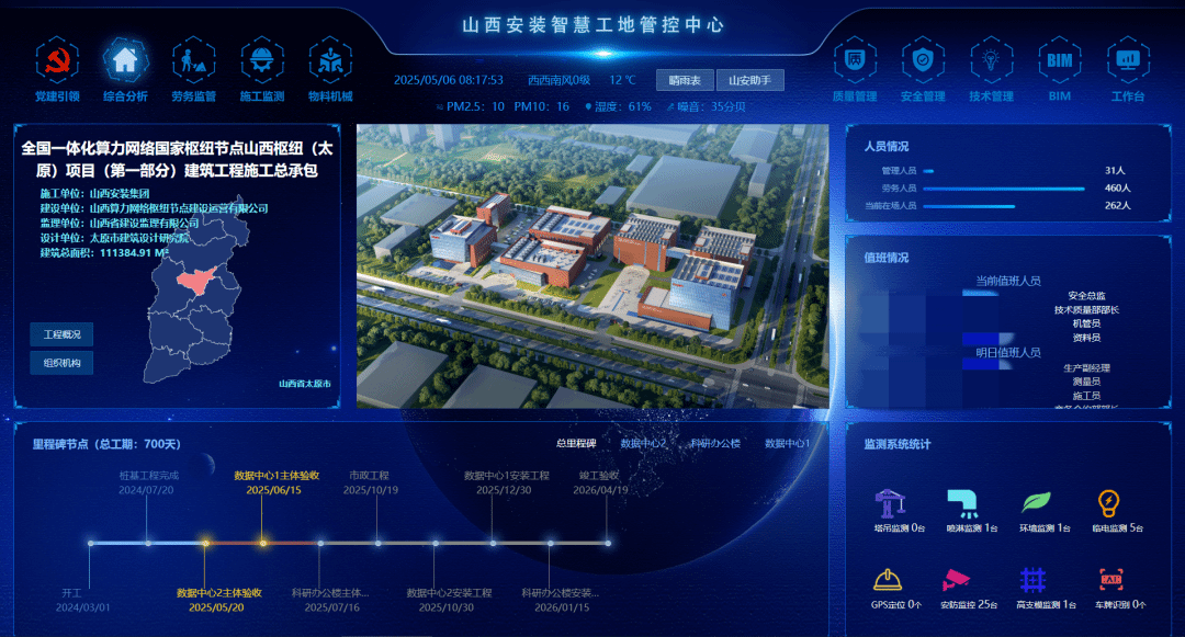 走進施工現(xiàn)場,智慧工地的科技氣息撲面而來。項目深度融合數(shù)字技術(shù)與工程管理,應(yīng)用智慧工地管控平臺,讓工程建設(shè)更加安全高效。
