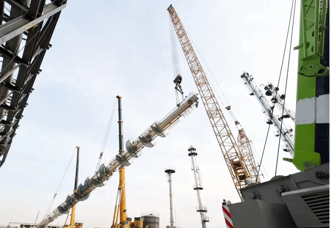 2025年3月,項目低溫甲醇洗裝置吸收塔吊裝就位。由于廠區(qū)布局緊湊,吊裝施工區(qū)域有限,為了順利完成高74米、起吊重量182噸的吸收塔吊裝作業(yè),項目團(tuán)隊反復(fù)模擬,最終采用三機抬吊的施工方案,在700噸履帶式起重機主吊,600噸、300噸兩臺汽車吊的高效協(xié)同作業(yè)下,順利實現(xiàn)“塔起燈亮”吊裝就位。標(biāo)志著項目大型設(shè)備吊裝任務(wù)全部完成,正式進(jìn)入設(shè)備安裝與調(diào)試階段。