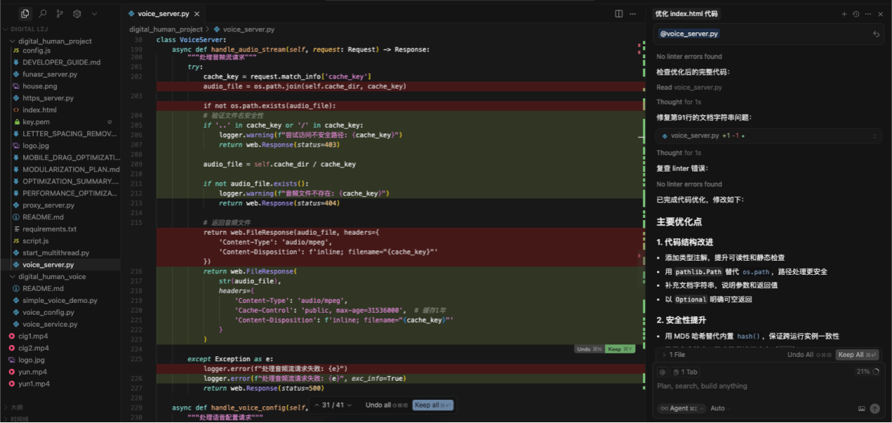 在企業(yè)數(shù)字人開發(fā)全流程中,公司創(chuàng)新性應(yīng)用了人工智能大模型的標(biāo)準(zhǔn)化代碼生成能力,在確保系統(tǒng)架構(gòu)、功能邏輯、源代碼等關(guān)鍵環(huán)節(jié)、技術(shù)自主可控的前提下,實現(xiàn)利用大模型進(jìn)行企業(yè)數(shù)字人代碼開發(fā)的自動化編程、智能優(yōu)化調(diào)試及測試,使研發(fā)人員將工作重心從基礎(chǔ)代碼編寫轉(zhuǎn)向?qū)诵哪P图按a框架進(jìn)行精細(xì)調(diào)優(yōu),這不僅顯著縮短了開發(fā)周期、提升了開發(fā)效率,更從根本上保障了底層技術(shù)的可靠性與先進(jìn)性,為提升產(chǎn)品質(zhì)量奠定了堅實基礎(chǔ)。