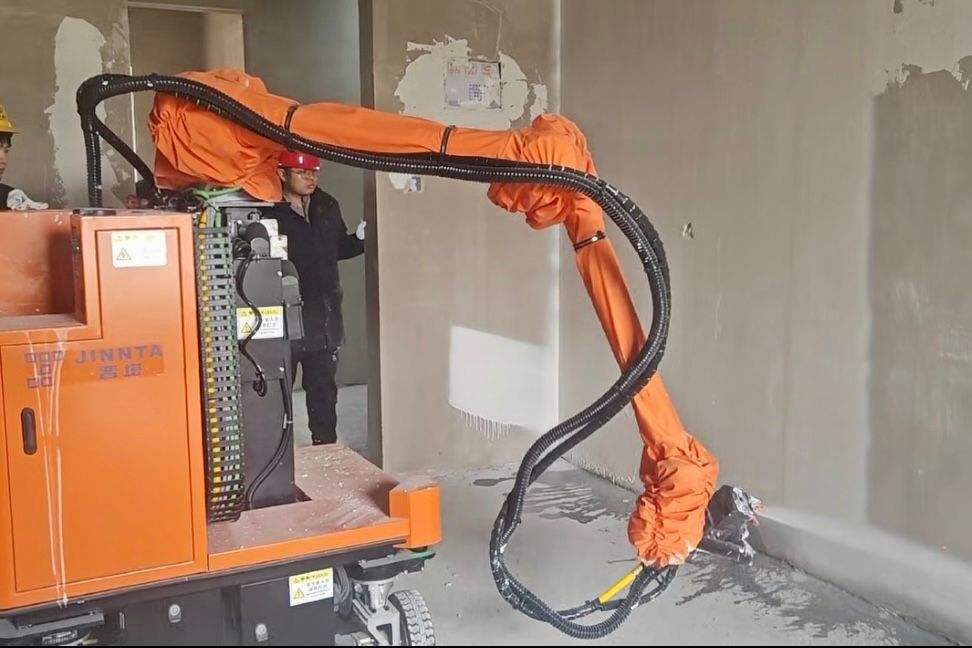 在山西師范大學南校區(qū)建設(shè)項目,晉塔智能機器人表現(xiàn)優(yōu)異。噴刮打磨一體機器人憑借視覺導航技術(shù)精準定位作業(yè)區(qū)域,機械臂靈活運轉(zhuǎn),墻角、陰陽角等復(fù)雜部位一次成型,施工作業(yè)幾乎不產(chǎn)生粉塵,讓施工環(huán)境更綠色環(huán)保。該設(shè)備30分鐘即可完成100m2的作業(yè)量,施工效率是人工輥涂、打磨的5倍以上,姿態(tài)誤差±1°,定位精度±5 cm。在人機施工效果對比宿舍展區(qū),機器人作業(yè)墻面與傳統(tǒng)施工作業(yè)墻面對比鮮明,其作業(yè)均勻度遠超人工操作,現(xiàn)場觀摩人員直觀感受到“機械化換人、自動化減人”的顯著優(yōu)勢。