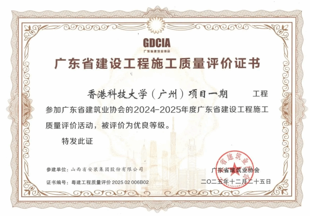 近日,山西建投安裝集團(tuán)香港科技大學(xué)(廣州)項(xiàng)目一期工程榮獲廣東省建設(shè)工程施工質(zhì)量優(yōu)良等級(jí)評(píng)價(jià),標(biāo)志著安裝集團(tuán)在粵港澳大灣區(qū)機(jī)電安裝市場的競爭力再獲認(rèn)可。