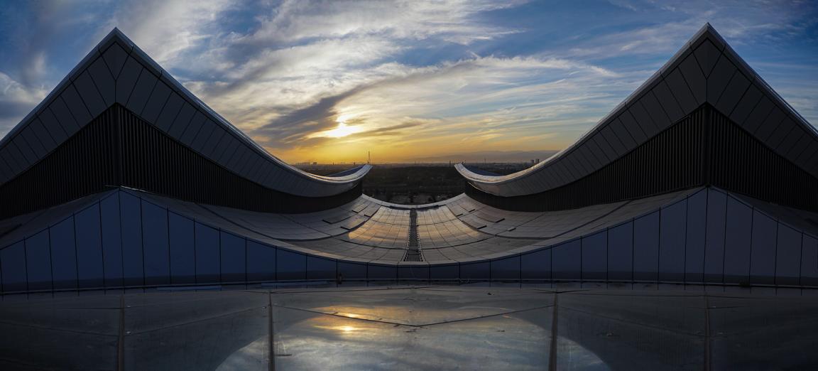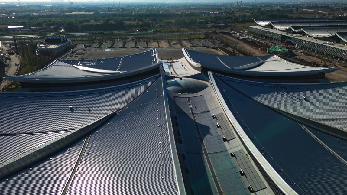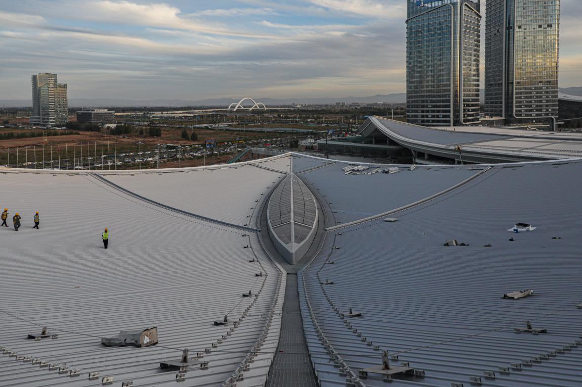 項(xiàng)目屋頂在設(shè)計(jì)階段通過(guò)防墜落系統(tǒng)、融雪系統(tǒng)、虹吸雨排系統(tǒng)解決了屋面面積大、檢修及排水困難等問(wèn)題。項(xiàng)目技術(shù)班組通過(guò)建立BIM模型進(jìn)行節(jié)點(diǎn)優(yōu)化、指導(dǎo)加工下料,以技術(shù)保障實(shí)現(xiàn)預(yù)期效果。施工階段采用了雙曲面鍍鋁鋅鋼板金屬屋面(不滑移)系統(tǒng)、直立鎖邊技術(shù),有效提高了金屬屋面整體性能,增強(qiáng)了屋面防水和抗風(fēng)揭能力。十字交通廳及中心穹頂采用三維模擬分割、雙曲夾膠玻璃加工、旋轉(zhuǎn)桁架高空吊裝、接縫防水等針對(duì)性技術(shù)和工藝措施,高質(zhì)高效完成了異形雙曲面單元玻璃板塊的定制安裝,從物理和心理雙重層面實(shí)現(xiàn)了“凝心聚力”的設(shè)計(jì)理念。