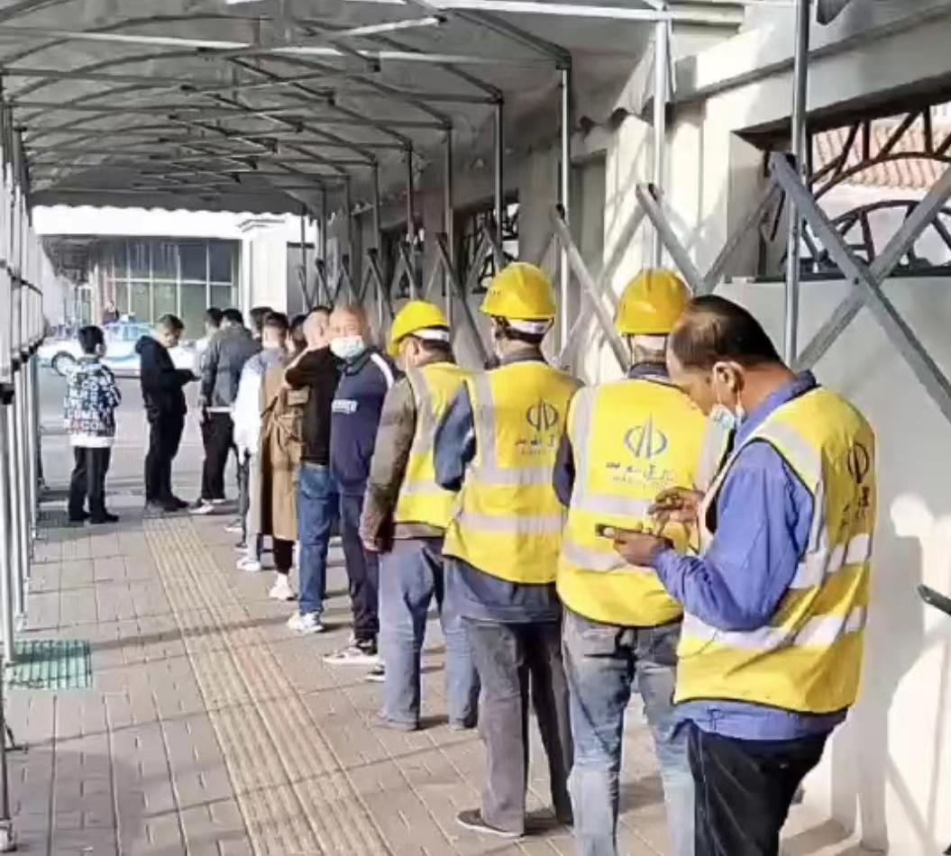 項目部入口處設立疫情防控崗,安排人員每天24小時值班,對所有進出人員嚴格落實測溫登記和三碼聯(lián)查,做好排查登記工作,嚴格執(zhí)行防疫要求,對公共區(qū)域、辦公室、職工宿舍、食堂等區(qū)域進行每日消毒。為提高疫情防控工作科學性,防患未然、精準施策,項目部根據(jù)當?shù)匾咔榉揽剞k公室安排,第一時間、錯峰安排所有工作人員和勞務人員工進行核酸檢測,確保不漏一人。同時加強對施工現(xiàn)場人員思想管理,利用每日班前會對作業(yè)人員進行崗前安全教育,同時開展疫情防控知識宣貫,時刻提醒和引導從業(yè)人員提高安全意識、落實防疫措施,從思想慣性上樹立個人防護的緊迫意識,形成了“防控不落空,項目不停工”的良好局面。