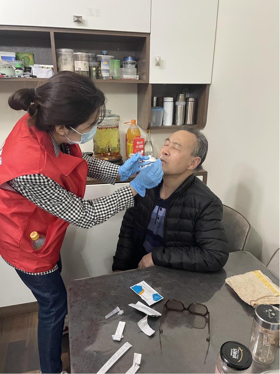 (志愿者協(xié)助社區(qū)工作人員為居民發(fā)放自測(cè)新冠抗原試劑盒,幫助老人幼兒檢測(cè),確保不漏一戶一人。)