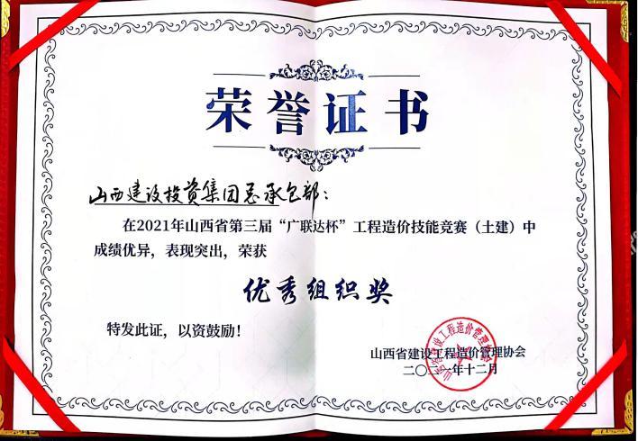 12月18日,由山西省建設(shè)工程造價管理協(xié)會主辦的2021年山西省第三屆“廣聯(lián)達(dá)杯”工程造價技能競賽決賽在山西飯店舉行。公司榮獲安裝專業(yè)組“團(tuán)體一等獎”和“團(tuán)體優(yōu)秀組織獎”兩項(xiàng)榮譽(yù)。