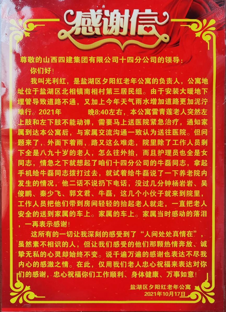 近日,運城市鹽湖區(qū)夕陽紅老年公寓負責人為公司承建的北相鎮(zhèn)鎮(zhèn)區(qū)集中供熱建設(shè)工程項目部送來了錦旗和感謝信,向項目人員致以濃濃謝意。