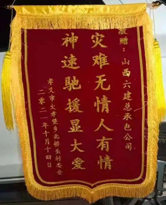 10月9日23時(shí),六建集團(tuán)總承包公司得知孝義市大孝堡鎮(zhèn)北橋頭村受災(zāi)嚴(yán)重,迅速組織防汛救災(zāi)愛心捐贈(zèng)行動(dòng),不到半天時(shí)間,第二天中午就為村里捐贈(zèng)了發(fā)電機(jī)1臺(tái)、污水泵6臺(tái)、水帶225米、雨衣20件、雨鞋20雙,并送到了村里。家住孝義市大孝堡鎮(zhèn)北橋頭村的員工梁月新自制愛心條幅,在捐贈(zèng)物資的同時(shí),幫助老鄉(xiāng)提振信心,點(diǎn)燃希望!