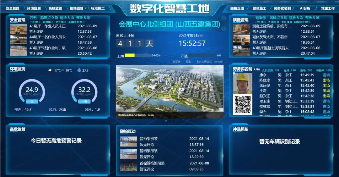 運用建投集團智慧工地平臺,及時對安全管理、環(huán)境監(jiān)測、勞務實名制管理等信息及時歸集、統(tǒng)計、分析、對比,實現(xiàn)項目可視化智能管理,提高工程管理信息化水平。