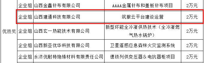 近日,2020年“創(chuàng)客中國(guó)”山西省中小企業(yè)創(chuàng)新創(chuàng)業(yè)大賽圓滿落幕。公司以“筑服云平臺(tái)建設(shè)運(yùn)營(yíng)”項(xiàng)目參賽,獲得企業(yè)組優(yōu)勝獎(jiǎng)的佳績(jī),同時(shí)獲得20000元的獎(jiǎng)勵(lì)。