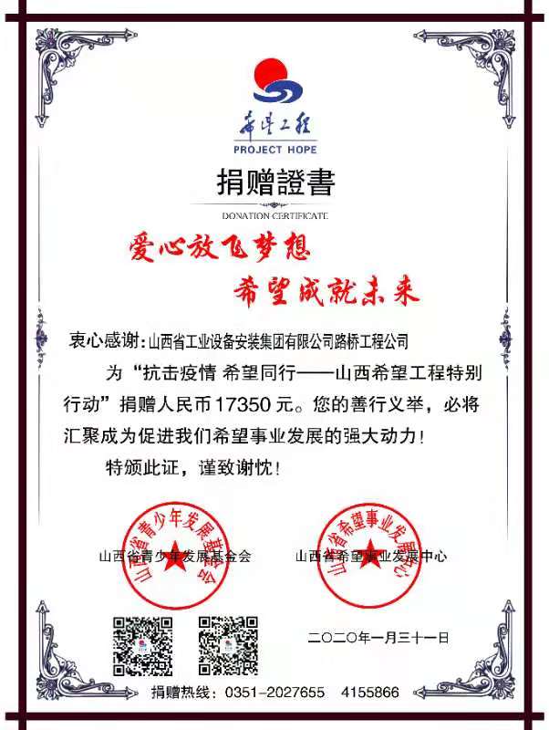 1月29日晚,路橋工程公司在微信群中號(hào)召全體職工積極參與支援武漢愛心捐款活動(dòng)。截至30日中午,一共募得人民幣17350元,全部捐贈(zèng)至“抗擊疫情 希望同行——山西希望工程特別行動(dòng)”。這筆愛心款將作為山西省援鄂醫(yī)療隊(duì)的藥品資助,為抗擊疫情做出貢獻(xiàn)。