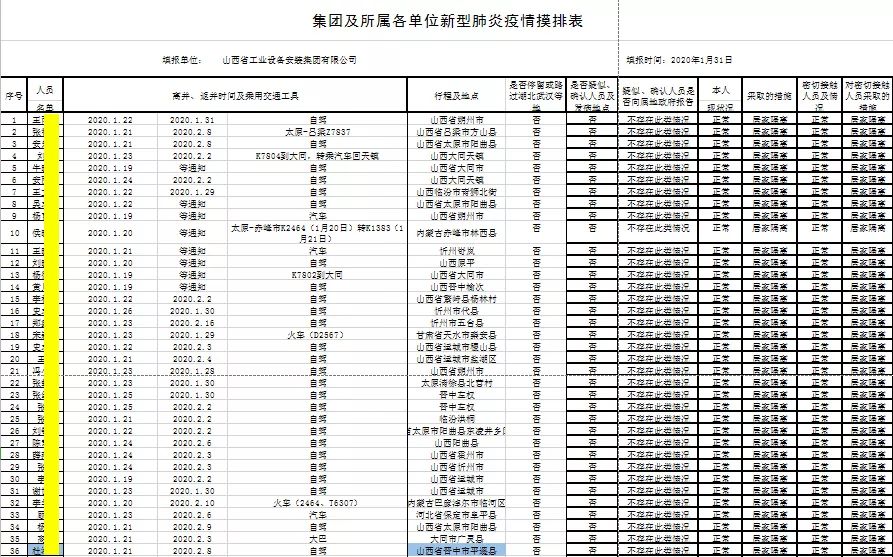 各單位、各部門逐級(jí)摸清職工和項(xiàng)目勞務(wù)人員的假期行程、活動(dòng)地點(diǎn),特別是自武漢來(lái)晉返晉途晉人員情況,每日向公司綜合辦公室上報(bào)。