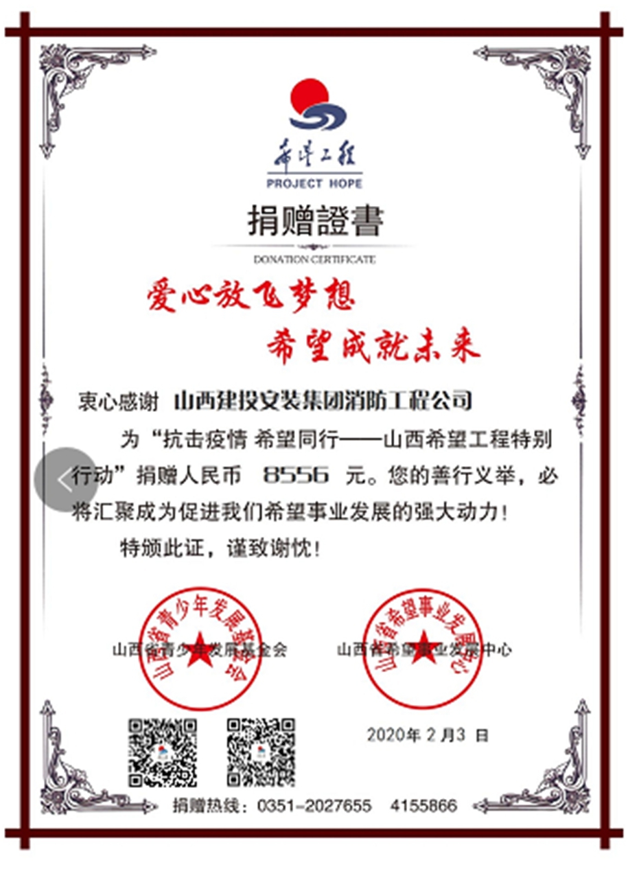 消防工程公司黨支部也于近日組織了愛心捐款活動(dòng)。僅用一天時(shí)間,共募得捐款8556元,已通過(guò)山西希望工程定向捐助到武漢,專用于疫情防控。