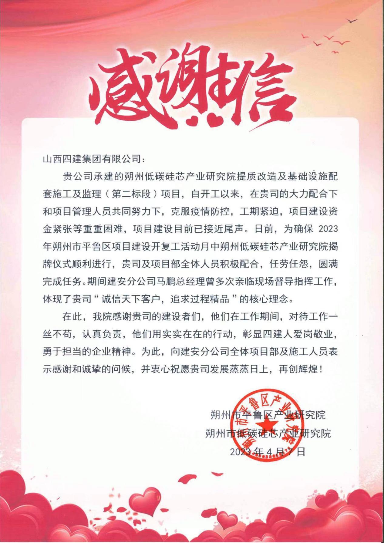 來自朔州市平魯區(qū)產(chǎn)業(yè)研究院和朔州市低碳硅芯產(chǎn)業(yè)研究院的感謝信