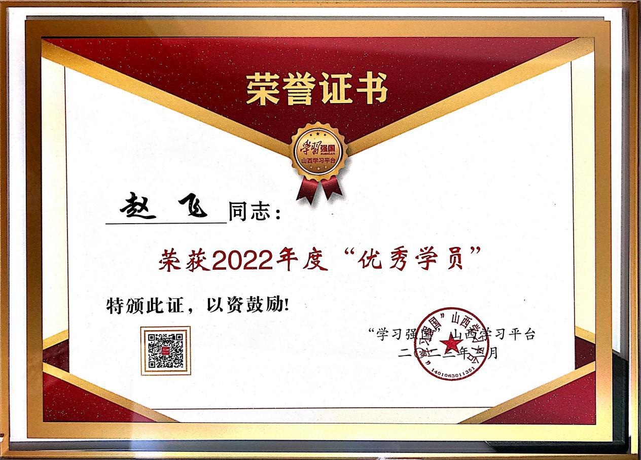 在2022年度“學(xué)習(xí)強國”山西學(xué)習(xí)之星、強國志愿之星、優(yōu)秀工作者、模范組織評選活動中,集團職工趙飛榮獲山西學(xué)習(xí)平臺優(yōu)秀學(xué)員稱號。
