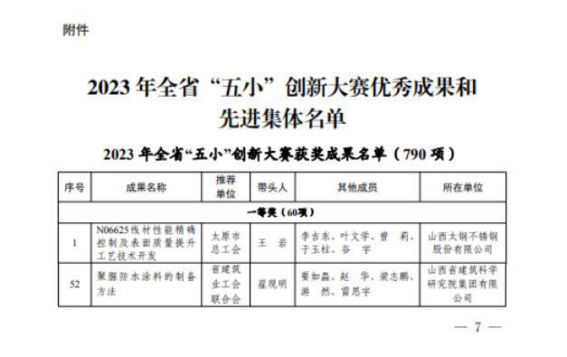 近日,由山西省總工會、共青團山西省委、山西省科學(xué)技術(shù)協(xié)會組織評選的山西省2023年“五小”創(chuàng)新大賽獲獎名單揭曉,山西建投建科院公司申報的《聚脲防水涂料的制備方法》憑借獨特的創(chuàng)新思維,在眾多參賽作品中脫穎而出,榮獲一等獎。