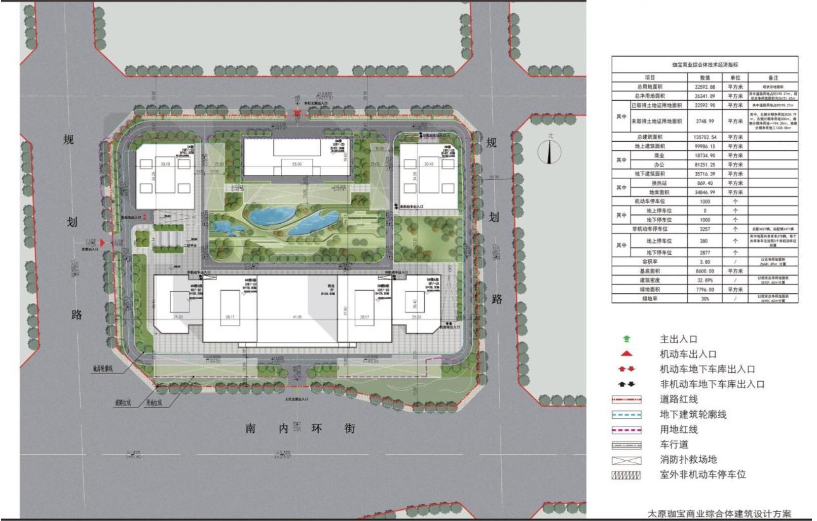 太原珈寶廣場商業(yè)綜合體工程項目位于太原市迎澤區(qū),南內環(huán)街東延與馬莊路交匯西北側。項目總用地面積22592.88平方米,總建筑面積135702.54平方米,用途涉及商業(yè)和辦公,規(guī)劃機動車停車位1000個,容積率3.80,建筑密度32.89%,綠地率30%。