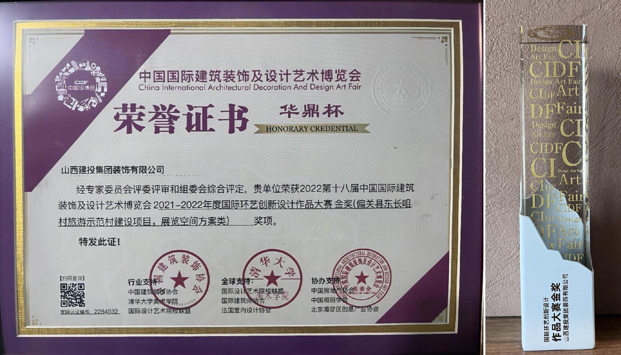 近期,第十八屆中國國際建筑裝飾及設(shè)計藝術(shù)博覽會在北京雁棲湖國際會展中心召開,會上山西建投裝飾公司獲得2021-2022年度中國建筑裝飾行業(yè)最具工匠精神設(shè)計機構(gòu)獎(山西省鄉(xiāng)村建設(shè)一站式綜合服務(wù)建設(shè)項目)、國際環(huán)藝創(chuàng)新設(shè)計作品大賽金獎(偏關(guān)縣東長咀村旅游示范村建設(shè)項目,展覽空間類)。