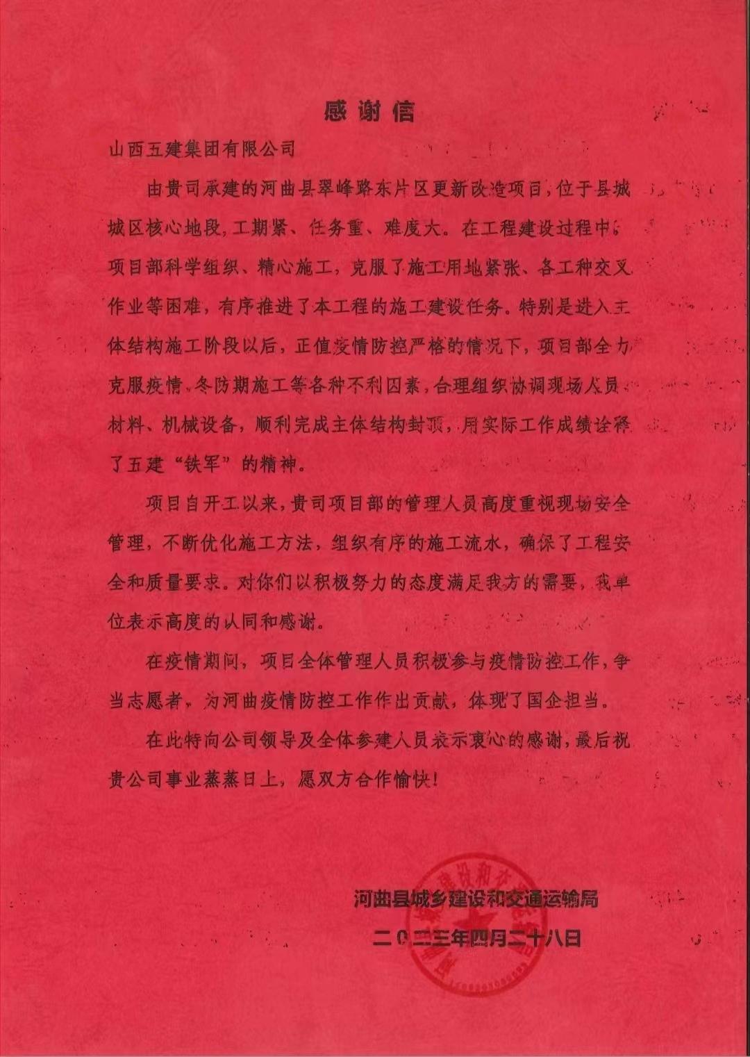 4月28日,河曲縣翠峰路東片區(qū)更新改造項目收到來自河曲縣城鄉(xiāng)建設(shè)和交通運輸局的感謝信,信中對項目團隊科學組織,克服施工用地緊張、各工種交叉作業(yè)等困難,有序推進工程施工建設(shè)任務(wù)表示感謝,對項目團隊克服疫情、冬期施工等各種不利因素,順利完成主體結(jié)構(gòu)封頂表示肯定。