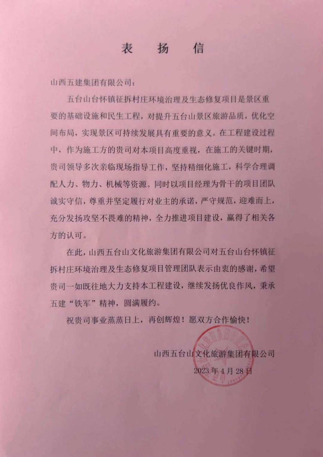 五臺山臺懷鎮(zhèn)征拆村莊環(huán)境治理及生態(tài)修復項目收到來自山西五臺山文化旅游集團有限公司的感謝信