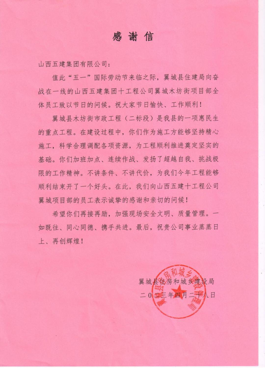 翼城縣木坊街市政工程(二標段)項目收到來自翼城縣住房和城鄉(xiāng)建設(shè)局的感謝信