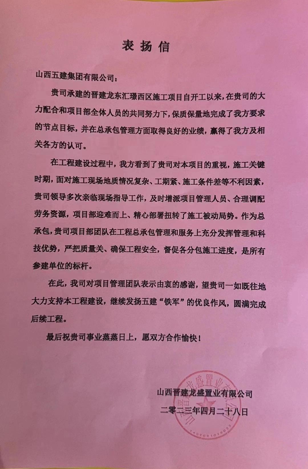 晉建·龍東匯璟(一期)西區(qū)施工項目收到來自山西晉建龍盛置業(yè)有限公司感謝信