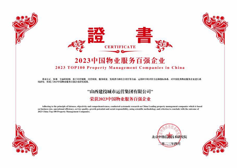 近日,2023中國物業(yè)服務百強企業(yè)研究成果發(fā)布會暨第十六屆中國物業(yè)服務百強企業(yè)家論壇在北京召開,會上山西建投城市運營集團榮獲“2023中國物業(yè)服務百強企業(yè)”。
