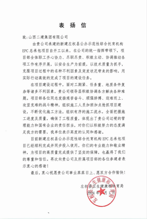 新建左權縣公辦示范性綜合托育機構EPC總承包項目收到縣委縣政府左權縣衛(wèi)生健康和體育局發(fā)來的表揚信。信中指出,二建集團高度重視、統(tǒng)一協(xié)調、齊抓共管,項目團隊在項目建設過程中秉承“精心精品、專心專注”的建筑理念,全力以赴奔著既定目標奮發(fā)努力,實現(xiàn)工程總目標,對二建集團過硬的管理能力和責任擔當表示高度認同。