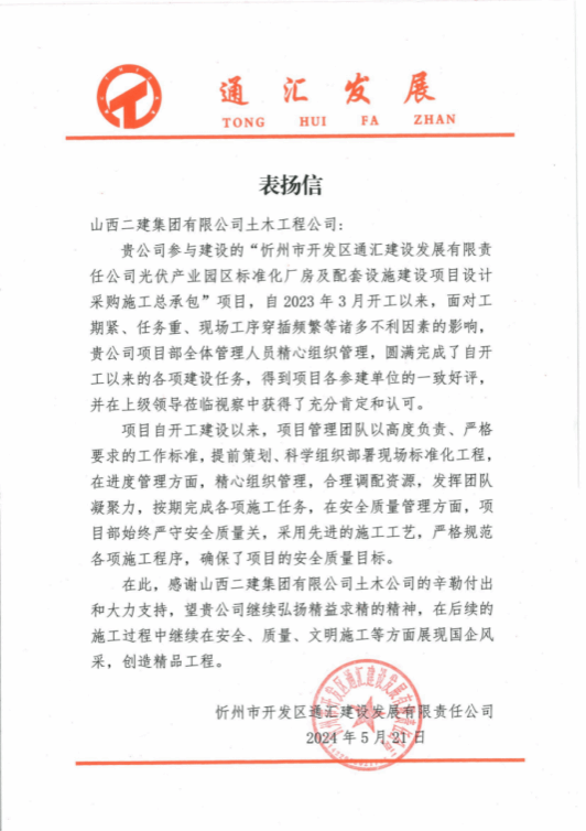 光伏產業(yè)園區(qū)標準化廠房及配套設施建設項目收到建設單位表揚信。作為忻州地區(qū)的重點建設工程,該項目是加快推動忻州市開發(fā)區(qū)全方位高質量發(fā)展的標桿項目。開工以來,項目部高質量、高標準、按時完成工程建設任務,以實際行動踐行“崇尚信譽、精求質量、強健素質、至誠服務”,獲得了建設單位的嘉獎及認可。