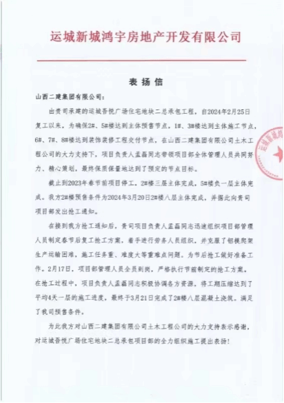 運城吾悅廣場住宅地塊二總承包工程1#、3#、5#、6#、7#住宅項目收到運城新城鴻宇房地產開發(fā)有限公司的表揚信。信中對項目部負責人在收到搶工通知后,迅速組織管理人員制定方案,克服鋁模爬架春節(jié)生產運輸困難,施工任務重、難度大等重難點問題提出表揚。