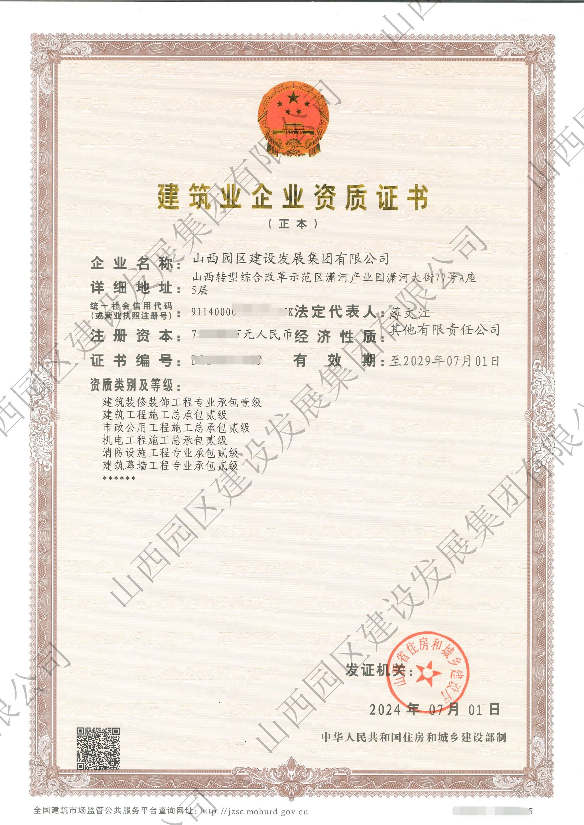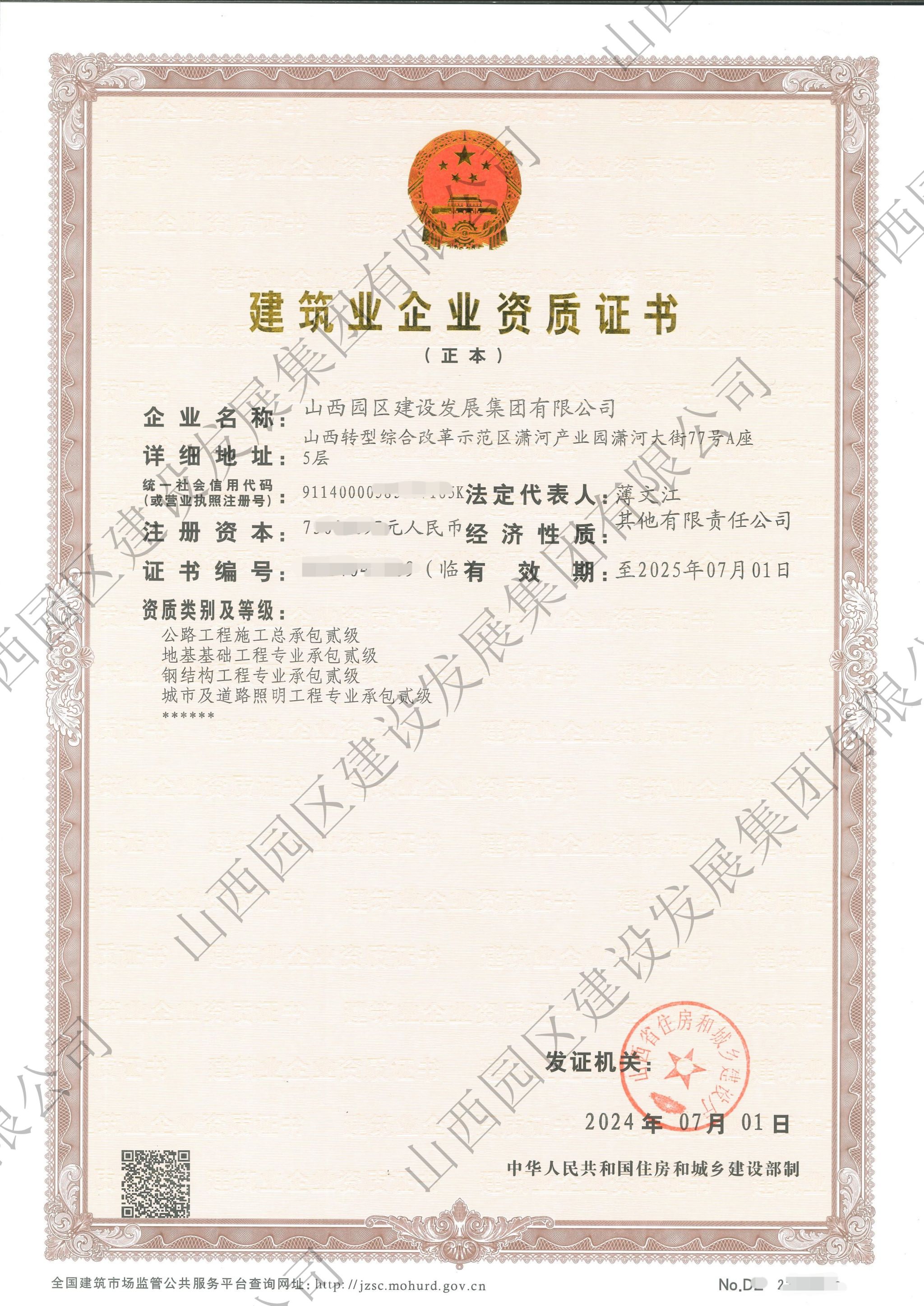 7月1日,山西建投園區(qū)建發(fā)集團(tuán)公路工程施工總承包、地基基礎(chǔ)工程專業(yè)承包、鋼結(jié)構(gòu)工程專業(yè)承包、城市及道路照明工程專業(yè)承包4項(xiàng)建筑業(yè)企業(yè)資質(zhì)由叁級(jí)升至貳級(jí)。