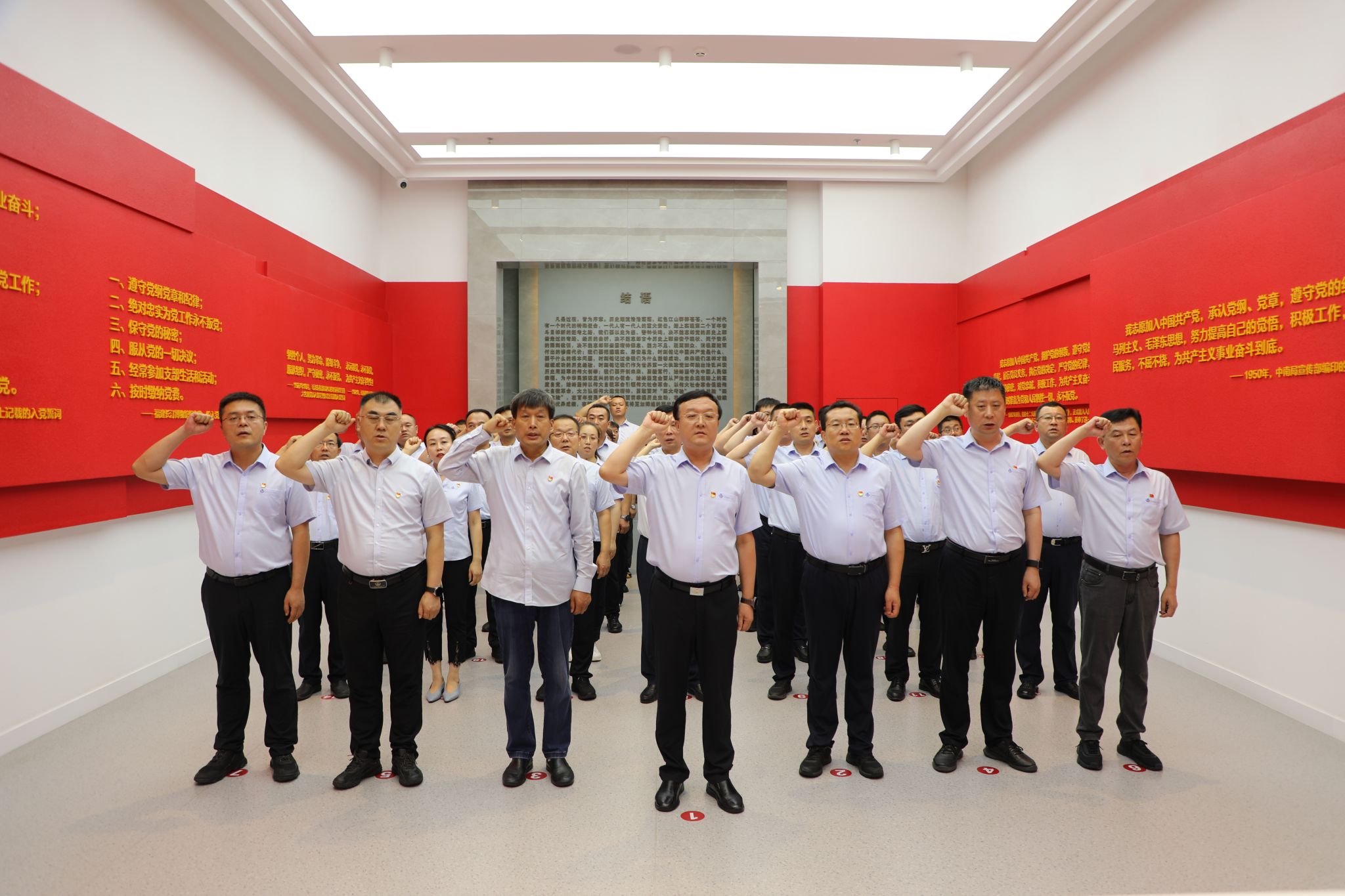 在宣誓廳,面對鮮艷的中國共產(chǎn)黨黨旗,大家舉起右拳,用鏗鏘有力的聲音,一起重溫入黨誓詞。