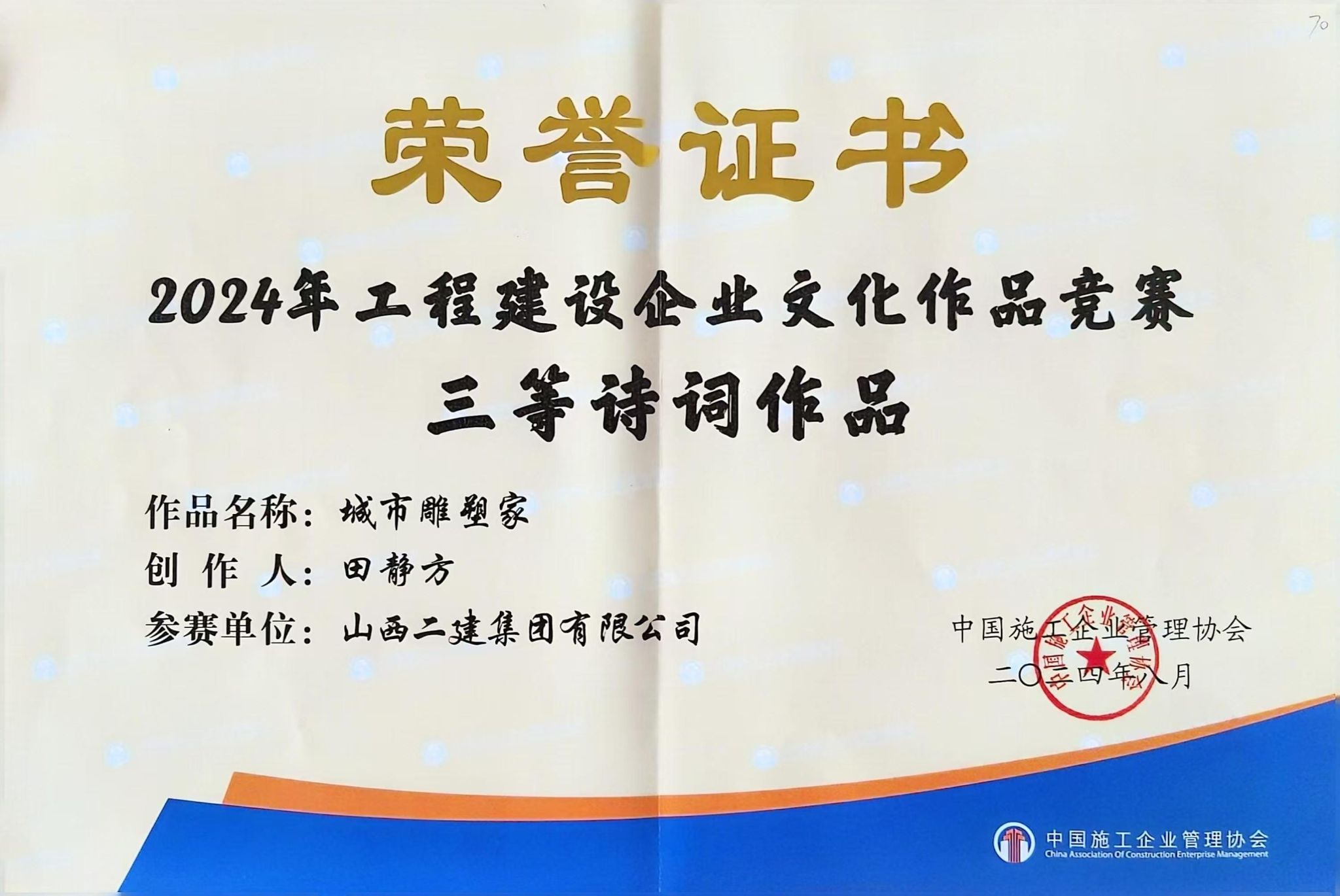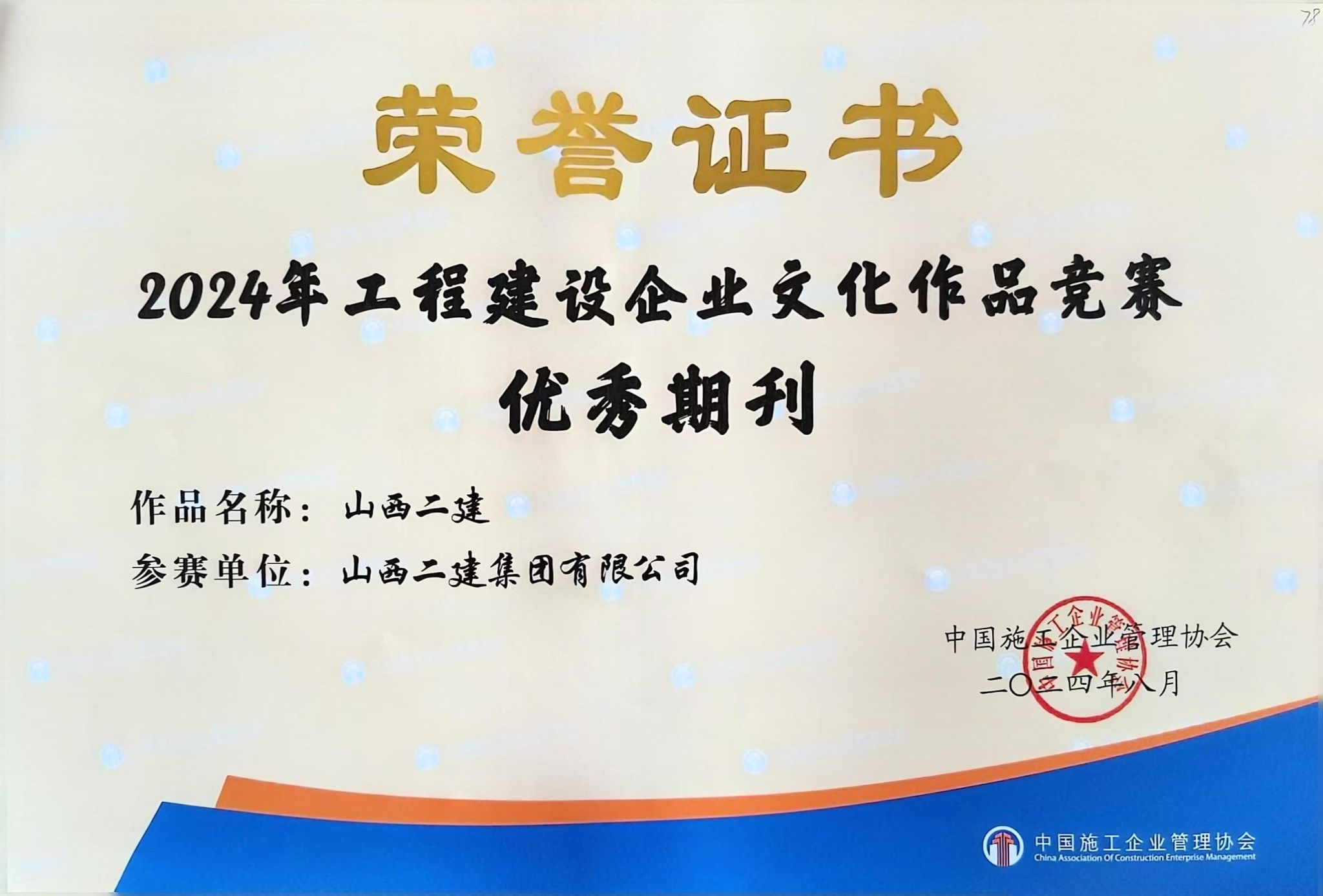 9月5日至6日,在2024年工程建設(shè)企業(yè)文化建設(shè)成果交流會(huì)上,山西建投二建集團(tuán)微信公眾號(hào)、《山西二建》內(nèi)刊分別榮獲2024年工程建設(shè)企業(yè)優(yōu)秀公眾號(hào)、優(yōu)秀期刊,案例《以企業(yè)文化建設(shè)厚植企業(yè)高質(zhì)量發(fā)展優(yōu)勢(shì)》榮獲2024年工程建設(shè)企業(yè)文化建設(shè)優(yōu)秀案例,職工創(chuàng)作的繪畫及詩(shī)詞作品分別榮獲二等獎(jiǎng)、三等獎(jiǎng)。