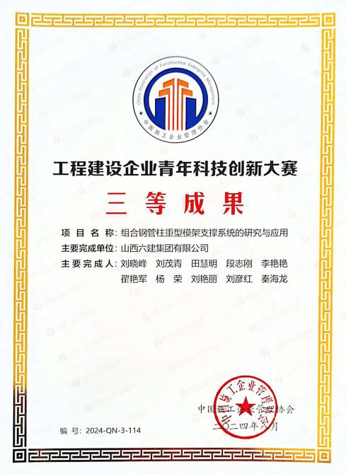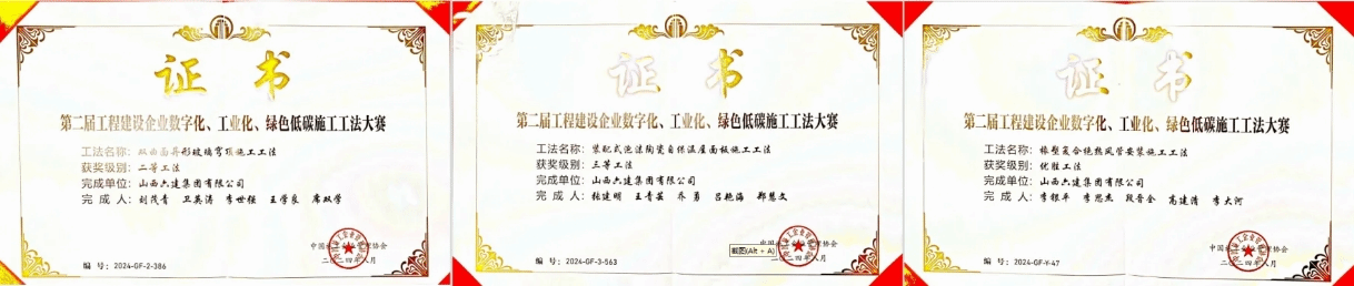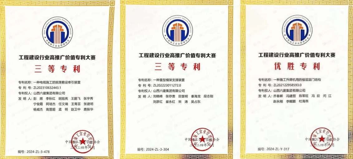 大賽結(jié)果中,山西建投六建集團(tuán)申報(bào)的《一種微型頂管管道內(nèi)電力排管施工方法》《一種用于弧形箱梁翼緣板的可調(diào)式模架》《一種施工現(xiàn)場圍擋用抑塵清潔裝置》分別獲得工程建造微創(chuàng)新技術(shù)大賽二等獎(jiǎng)、三等獎(jiǎng),《一種電纜施工防脫落敷設(shè)牽引裝置》《一種重型模架支撐裝置》《一種施工升降機(jī)用的樓層層門結(jié)構(gòu)》分別獲得工程建設(shè)行業(yè)高推廣價(jià)值專利大賽三等獎(jiǎng)和優(yōu)勝獎(jiǎng),《雙曲面異形玻璃穹頂施工工法》《裝配式泡沫陶瓷自保溫屋面板施工工法》《橡塑復(fù)合絕熱風(fēng)管安裝施工工法》分別獲得工程建設(shè)企業(yè)“數(shù)字化、工業(yè)化、綠色低碳”施工工法大賽二等獎(jiǎng)、三等獎(jiǎng)和優(yōu)勝獎(jiǎng);《組合鋼管柱重型模架支撐系統(tǒng)的研究與應(yīng)用》獲得首屆工程建設(shè)企業(yè)青年科技創(chuàng)新大賽三等獎(jiǎng)。