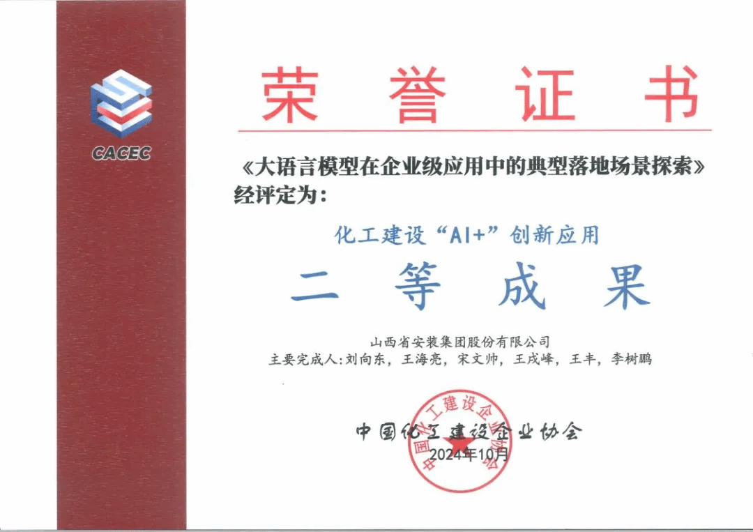 10月,中國化工建設企業(yè)協(xié)會發(fā)布了第一批化工建設“AI+”應用成果,其中,安裝集團《大語言模型在企業(yè)級應用中的典型落地場景探索》獲二等創(chuàng)新應用成果。