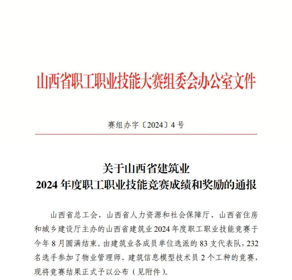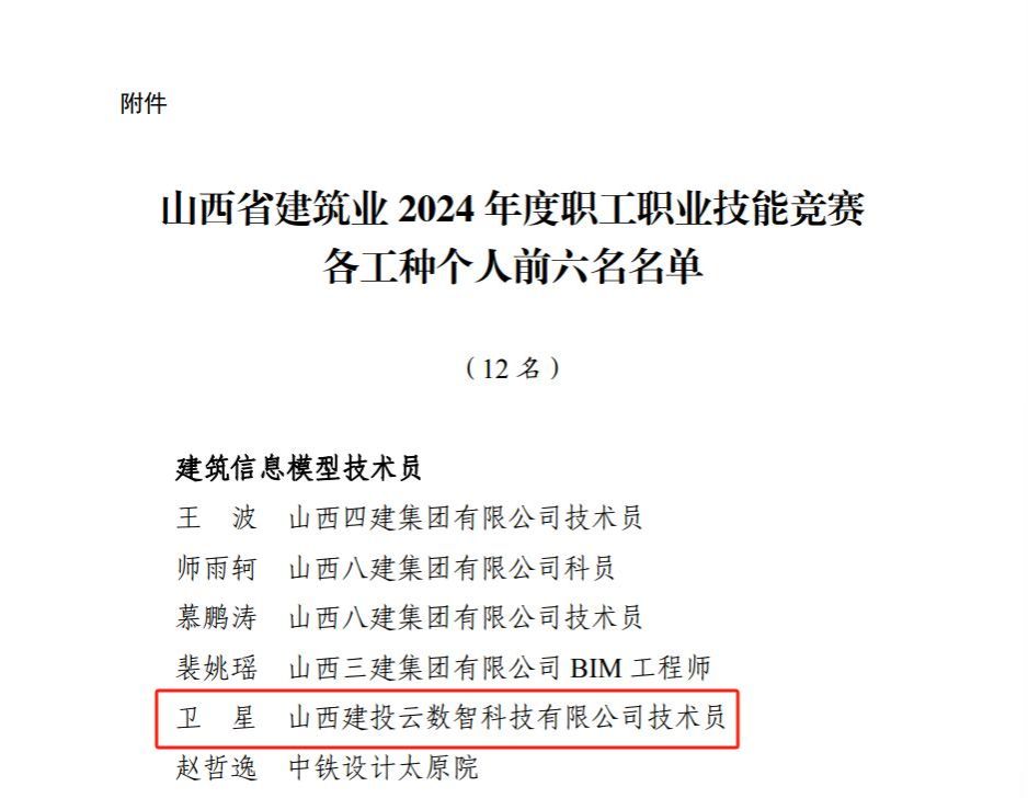 由山西省總工會、山西省人社廳、山西省住建廳聯(lián)合舉辦的山西省建筑信息模型(BIM)技術(shù)員技能競賽于8月在太原舉行。山西建投云數(shù)智公司選手衛(wèi)星在競賽中脫穎而出,榮獲第五名。