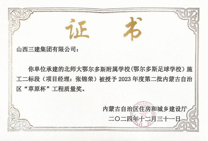 近日,從內(nèi)蒙古自治區(qū)住房和城鄉(xiāng)建設(shè)廳傳來(lái)喜訊,山西建投三建集團(tuán)承建的北師大鄂爾多斯附屬學(xué)校(鄂爾多斯足球?qū)W校)施工二標(biāo)段,榮獲內(nèi)蒙古自治區(qū)“草原杯”工程質(zhì)量獎(jiǎng)。