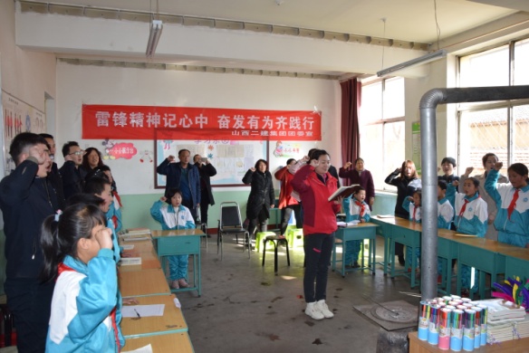 隨后,志愿者們來到了中莊寨村小學,為孩子們講述了雷鋒的故事,孩子們聽得津津有味,更加深刻領會到了新時期學習雷鋒精神的重要性。集團公司團青志愿者和全校的14個孩子、老師們共唱《學習雷鋒好榜樣》等歌曲,并共同宣誓。在互動游戲環(huán)節(jié)中,孩子們暢談了發(fā)生在自己身邊的好人好事。他們純真的笑臉、朗朗的讀書聲讓這個山村變得更加明亮而又充滿希望。我們也希望孩子們能時時刻刻在自己心中樹立起向雷鋒同志學習的理念,時時刻刻以雷鋒精神激勵著自己前進。最后,集團公司團青志愿者們還為孩子們發(fā)放了《雷鋒日記》等書籍及文具用品。